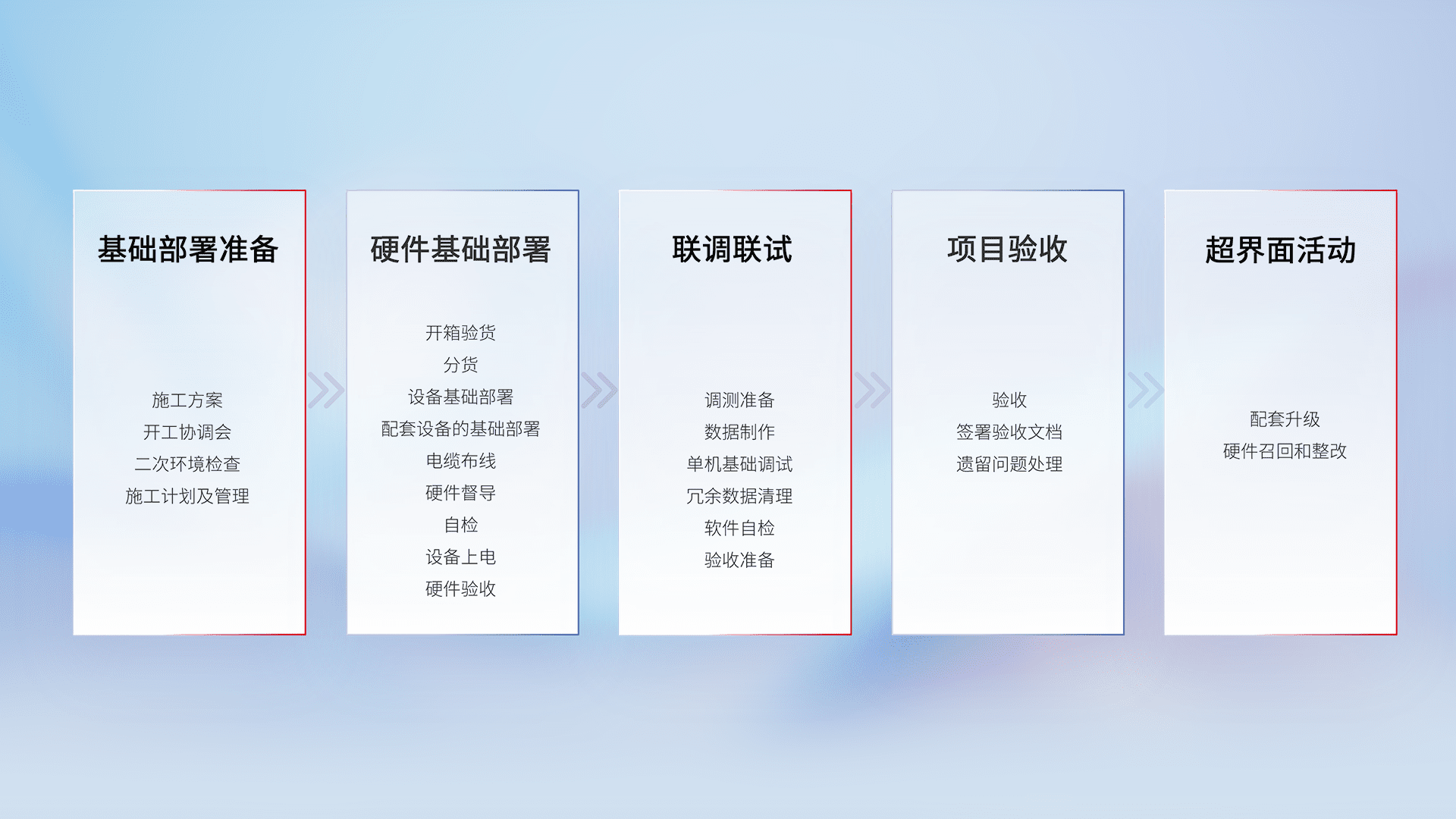 从基础部署准备、、硬件基础部署、、、联调联试、、项目验收、、、越界面活动的全过程可追溯,,,,保证施工质量和进度。。。